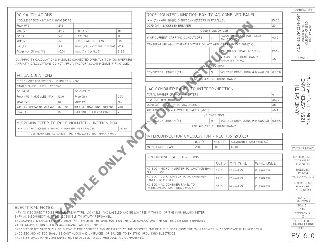 The electrical calculations page includes all DC and AC calculations for your project. This will satisfy the building plan review requirements for both DC and AC circuit calculations.