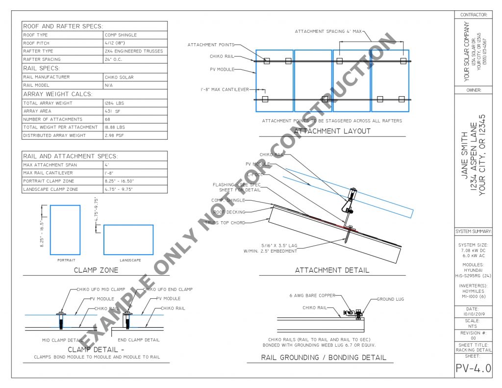 The racking detail page provides specifications and detail drawings on the type of roof and racking system used. This includes roof and rafter type and spacing, array weight calculations, racking attachment spacing, and module clamping.
